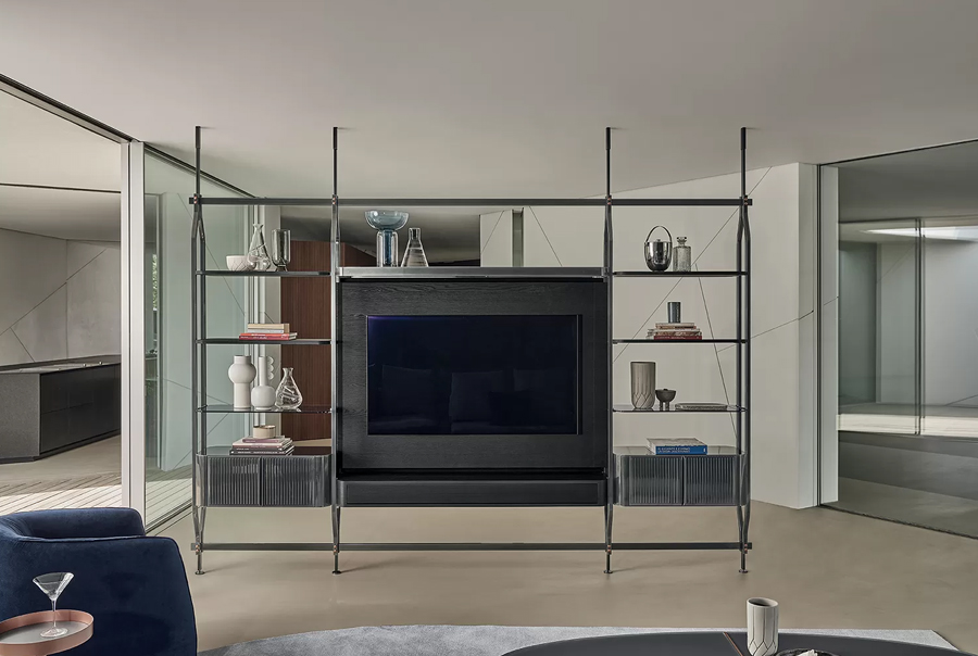 Bookcase with wall and ceiling fixing equipment designed for applying max 4/8/12/16/20 shelves and/or optional storages.