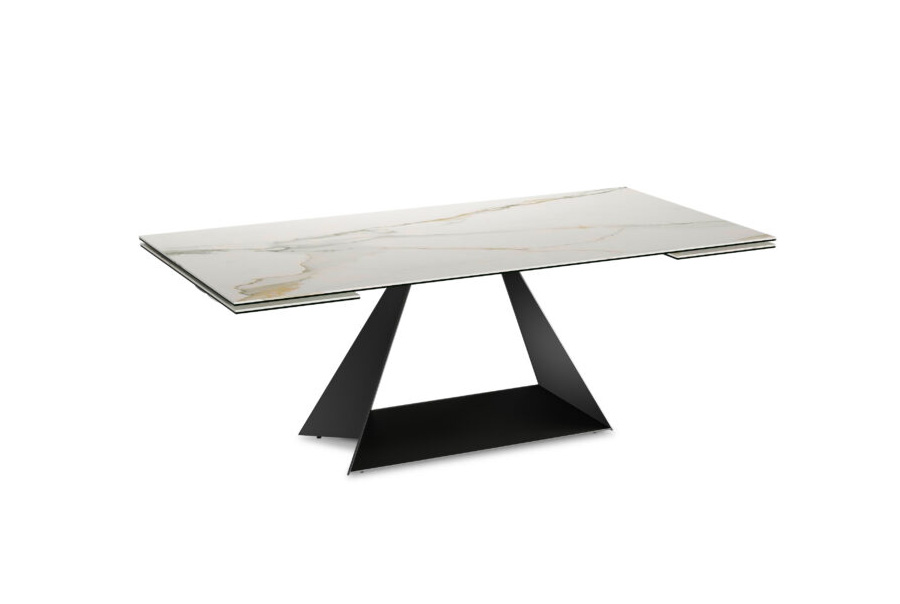Unabashedly modern, Prism was designed to make a bold, singular statement. Angles abound, from the folded steel construction to the sleek geometric lines of the body. We have paired this striking silhouette with our new extension mechanism for the utmost in ease, flexibility, and strength. Our extension mechanism provides smooth travel and exceptional rigidity, with none of the shakiness or noise of other extension tables. For a show-stopping effect, choose from two Italian ceramic tops: Nero in a gloss finish, or Blanco in a luscious matte finish. Or you can choose to have tempered clear glass tabletops so the beauty of the base is fully visible. Although shown with our new Circa dining chair, Prism will easily coordinate with any of our popular dining chairs. Available in all Elite powder-coat colors, Prism will show you the light. Companion round dining table and occasional tables are also available.