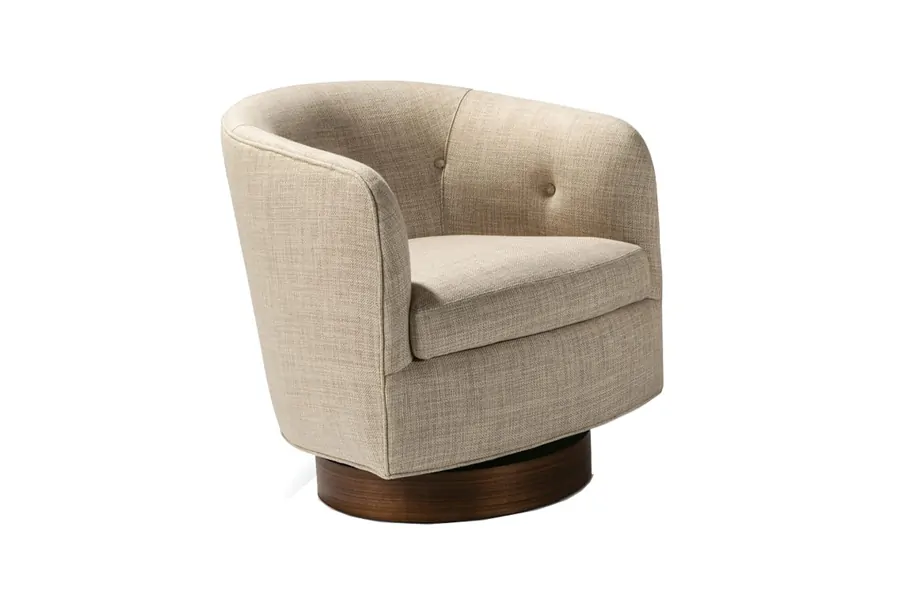 Originally designed in 1965 by Milo Baughman, the Roxy Would swivel-tilt tub chair is a modern classic. Featuring a walnut wood base, button tufting and our unique swivel-tilt mechanism, Roxy Would is a timeless lounge chair for all environs. Choose any of our in-house curated fabrics or leathers or provide COM. Select any TC wood finish on walnut for wood base.